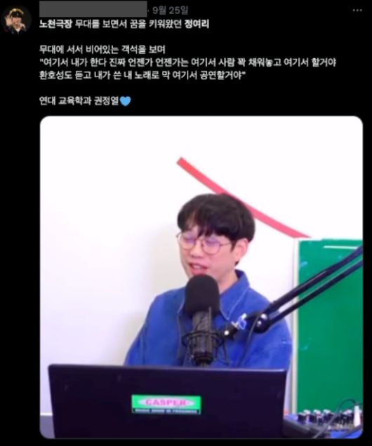 과거 한 영상을 통해 10CM(권정열)는 “학창시절 연세대 노천극장에서 내가 공연한다. 진짜 언젠가, 언젠가는 여기서 사람 꽉 채워 놓고 여기서 할 거야, 환호성도 듣고, 내가 쓴 내 노래로 막 여기서 공연할 거야”라고 다짐하며 가수의 꿈을 키운 사실을 전한 바 있다.
