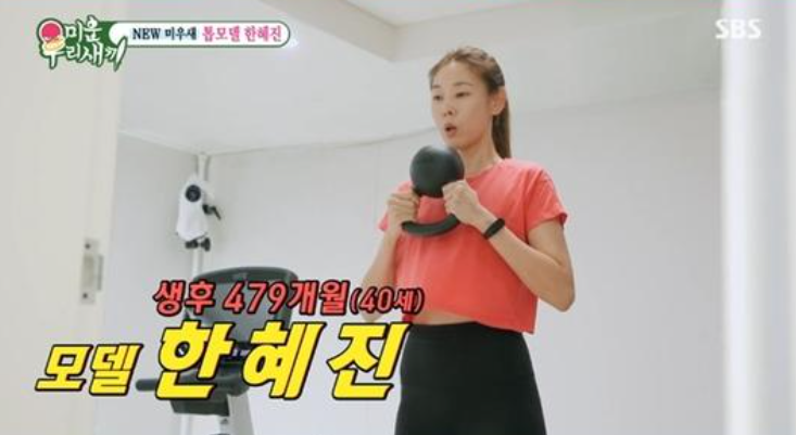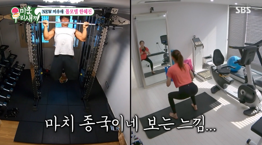 한혜진의 일상이 공개됐는데 한혜진은 기상 후 본인의 집에 마련된 운동방에서 곧장 운동 루틴에 돌입했다. 스쾃으로 워밍업 후 상체, 하체 그리고 전신까지 고난도 운동을 수행했다.