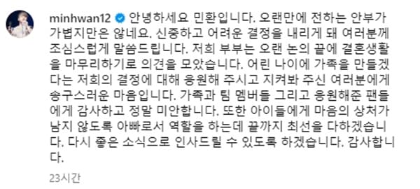 최민환은 "신중하고 어려운 결정을 내리게 됐다. 오랜 논의 끝에 결혼생활을 마무리하기로 했다"며 "어린 나이에 가족을 만들겠다는 저희의 결정에 대해 응원해 주시고 지켜봐 주신 여러분에게 송구스러운 마음"이라고 말했다.