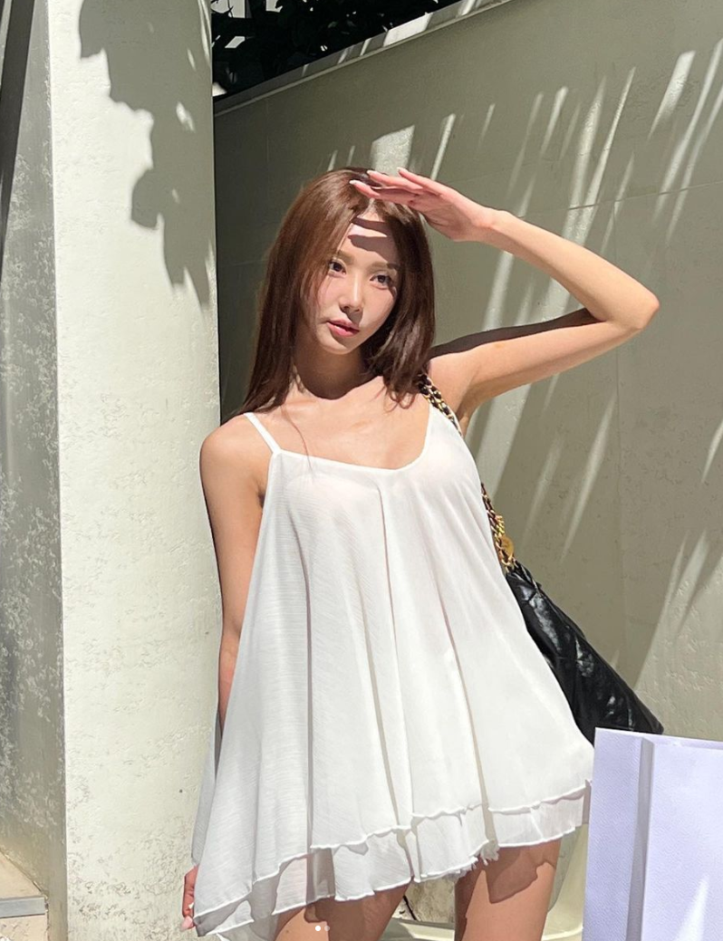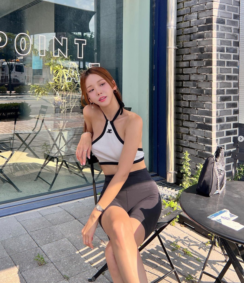 필라테스를 꾸준히 하면서 몸매 관리를 하고 있고 에스파 카리나를 닮은 섹시한 외모와 표정, 패션을 볼 수 있다.