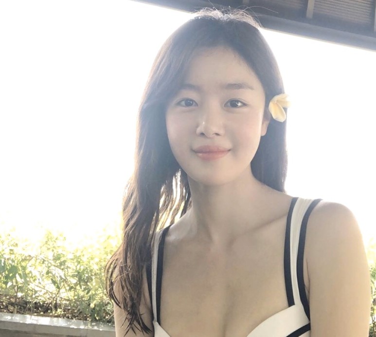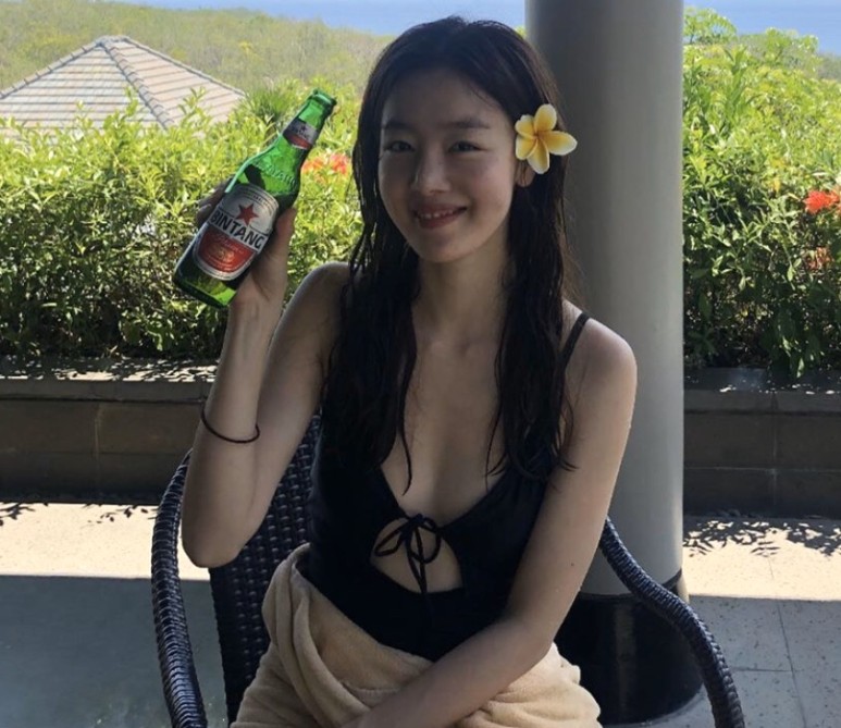 또한 한선화가 검은색 수영복을 입은 모습으로 군살 없는 몸매와 함께 아름다운 외모를 자랑했다.