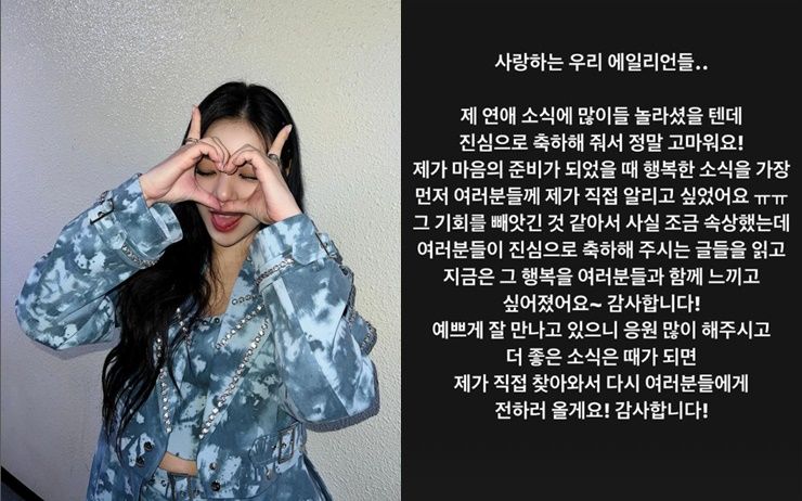 에일리는 자신의 인스타그램 스토리에 “내 열애 소식에 많이 놀랐을텐데 진심으로 축하해 줘서 정말 고맙다”며 팬들에게 남기는 글을 올렸다.