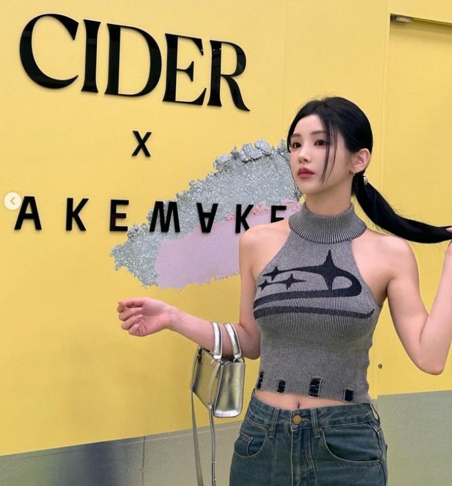 강다은이 서울의 샵사이다 팝업 스토어를 방문해 섹시한 민소매 배꼽티를 입은 채 인증샷을 남기고 있는 모습이 담겨 있다.
