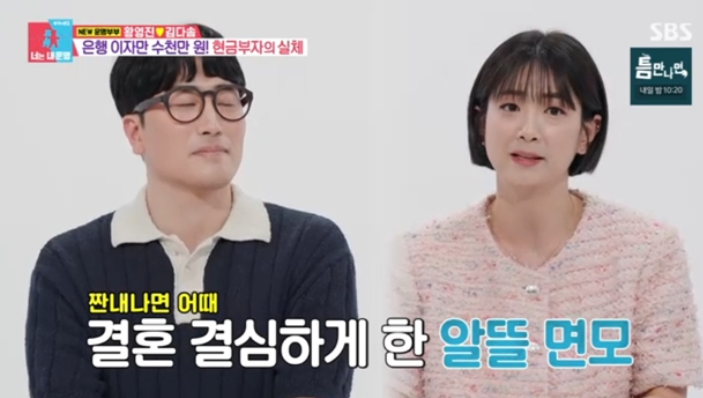 김다솜은 황영진의 짠돌이 면모에도 불구하고 결혼을 결심한 이유에 대해 "저도 어렸을 때부터 가정형편 좋지 않았다. '날 굶겨죽이지는 않겠구나' 싶어서 성실함에 반했다"고 전했다.