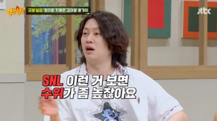 김희철은 지예은에게 "SNL 보면 수위가 좀 높지 않냐. 야한 얘기도 막 하고 풍선도 이만한 거 넣고"라고 말했다.