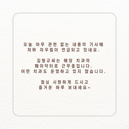 김윤아는 “김형규 씨는 해당 치과의 페이닥터로 근무 중이다다. 어떤 치과도 운영하고 있지 않다”며 “점심 시원하게 드시고 즐거운 하루 보내세요”라고 정정했다.