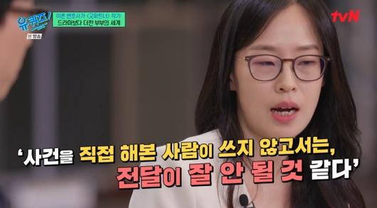 그 이유에 대해 최유나 변호사는 "'사건을 직접 본 사람이 쓰지 않고는 전달이 안 될 것 같다, 내가 잘할 수 있을 것 같다, 더 재밌을 것 같다' 생각했다"라고 솔직히 밝혔다.