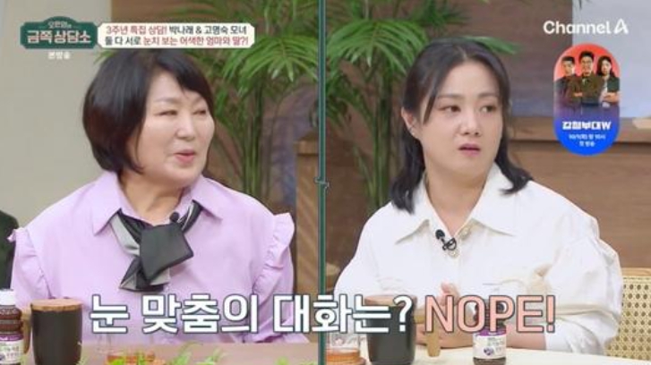방송에서 박나래 모친은 딸과 사이가 어색하다고 고백했는데 박나래는 심지어 서로 눈을 맞추고 대화하는 것보다는 나란히 앉는 편이 더 편하다고 말할 정도라고 밝혔다.