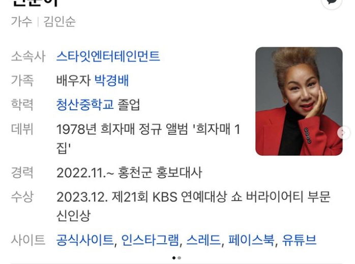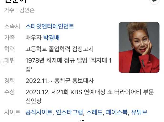 학력이 ‘청산중학교 졸업’에서 ‘고등학교 졸업 학력 검정고시’로 바뀌었다. 인순이는 최근 고등학교 졸업 학력 검정고시에 응시해 합격한 것으로 알려졌다.