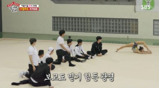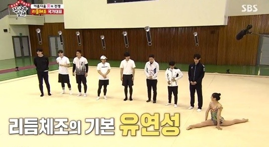 집사부일체 멤버 이승기, 신성록, 양세형, 차은우, 김동현은 태권도, 사격, 기계체조에 이어 리듬체조에까지 도전했다.