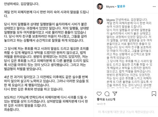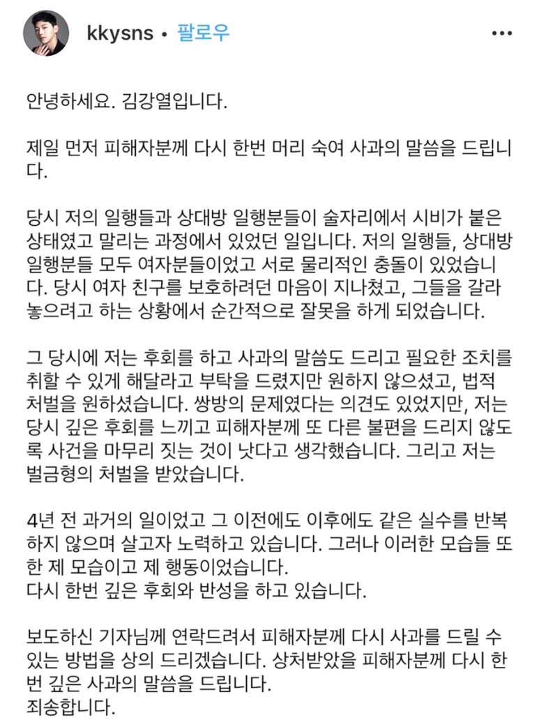 그리고 “4년 전 과거의 일이었고 그 이전에도 이후에도 같은 실수를 반복하지 않으며 살고자 노력하고 있다”고 설명한 김강열은 “그러나 이러한 모습들 또한 제 모습이고 제 행동이었다. 다시 한번 깊은 후회와 반성을 하고 있다”고 사과했다.