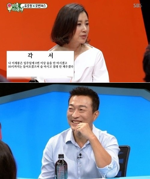 유호정은 SBS `미운 우리 새끼`에서 "남편이 술을 좋아한다. 일주일에 술을 몇 번만 마시고 몇 시까지 들어오겠다고 쓰게 하고는 지장까지 찍는데 똑같은 실수를 반복한다"며 "각서 써도 안 바뀌더라"라고 답답함을 토로했다.