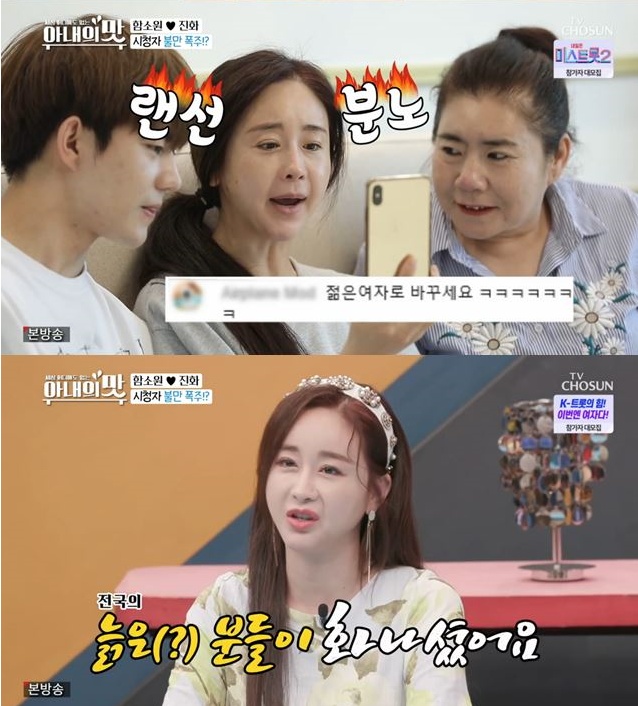 함소원은 “맞다. ‘젊은 여자’로 바꿔야 한다. 안 늙었는데 참 속상하다”라며 공감했다. VCR을 보던 함소원은 “전국의 늙은 여자분들이 다 화가났다”고 말했다.