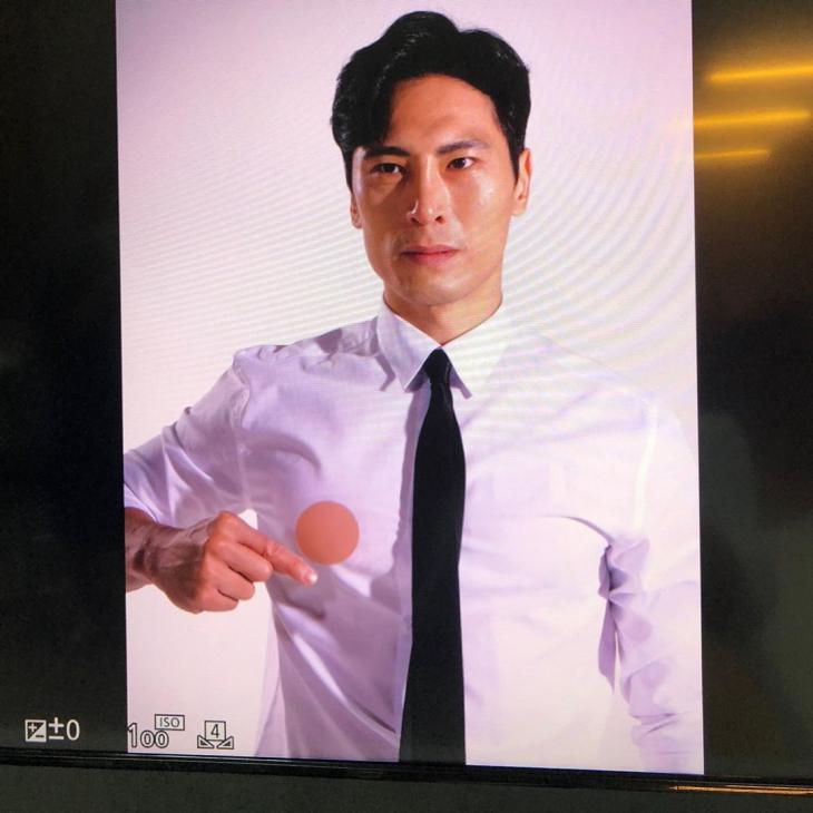 공개된 사진 속에는 니플밴드 광고를 촬영 중인 김재우의 모습이 담겨 있다. 특히 김재우의 심각한 표정과 대비되는 포즈가 눈길을 끈다.