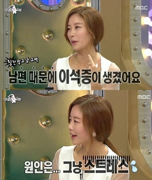 또한 MBC '황금어장-라디오스타'에 출연해서 남편 때문에 '이석증'을 앓고 있다는 사실을 밝혔었는데 원인은 남편에 의한 스트레스인 것으로 알려졌다.