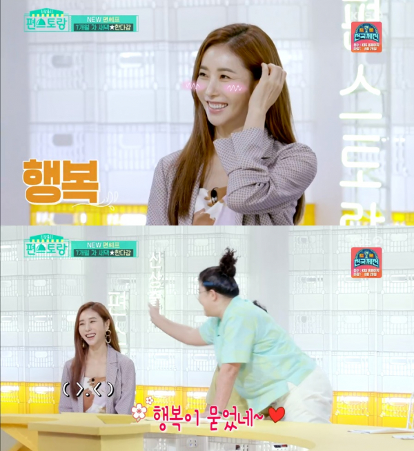 이영자는 "한다감 씨 얼굴에 뭐 묻었다. 행복이 묻었다"라며 결혼 후 얼굴이 밝아진 한다감을 칭찬했다.