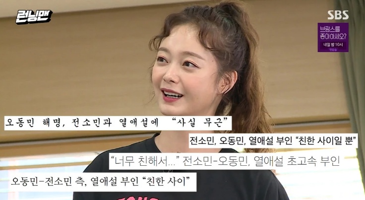 앞서 전소민은 연극배우 오동민과 열애설에 휩싸였고, 당시 오동민과의 관계에 대해 "친한 사이일 뿐"이라고 해명했다.