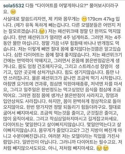 '최소라 다이어트'가 큰 파장이 되었는데 본인이 직접 인스타그램에 키와 몸무게를 밝혀 충격을 주었다. 다이어트 방법이라는 것이 패션위크 4주간 음식물의 섭취를 아예 금하고 물과 차만 먹는다는 내용이었다.