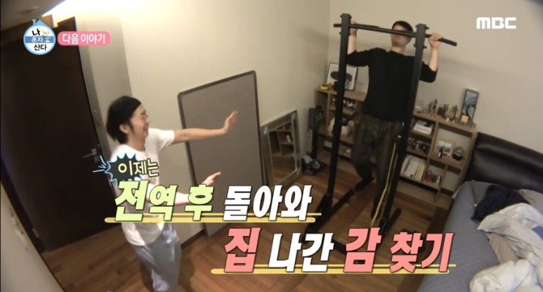 전역 후 돌아와 집나간 감 찾기에 나선 우영과 찬성은 먼저 몸 만들기에 나섰고 우영은 턱걸이를 몇개한 후 바로 포기하는 모습을 보였다.