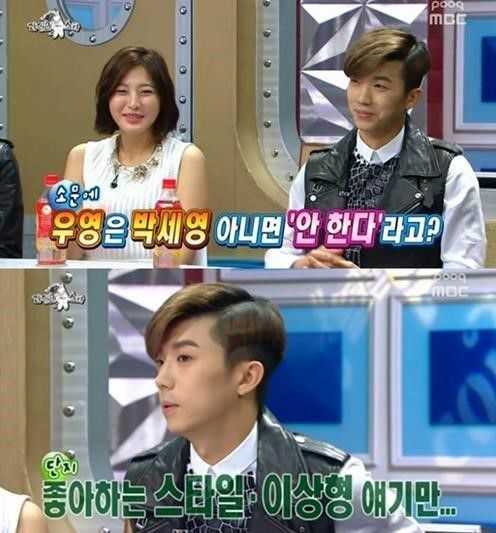 우영은 “박세영 아니면 ‘우결’을 안한다고 했다더라”는 MC들의 질문에 “그런 적은 절대 없다”고 해명했고 그러자 규현이 “같이 하고 싶은 사람이 누군지 물어보긴 하더라”고 말했다.
