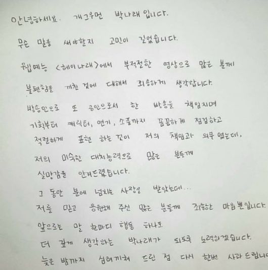 ‘헤이나래’ 방송 중 성희롱 발언으로 물의를 일으킨 데 대해 박나래는 자필 사과문을 자신의 인스타그램에 올렸다.