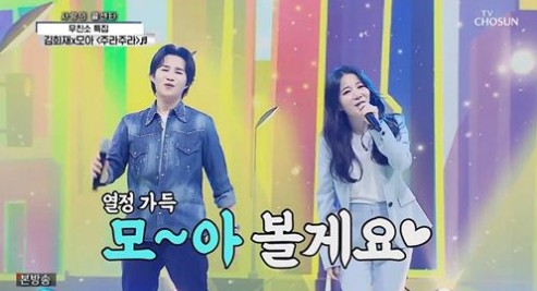 마아성은 남진의 '님과 함께'를 불렀고 풍채 좋은 모습으로 등장해 한복을 입고 흰 모자를 거꾸로 쓰고서 무대 위로 나섰다.