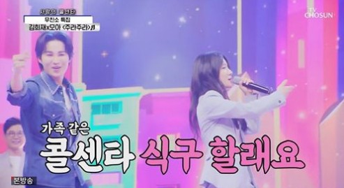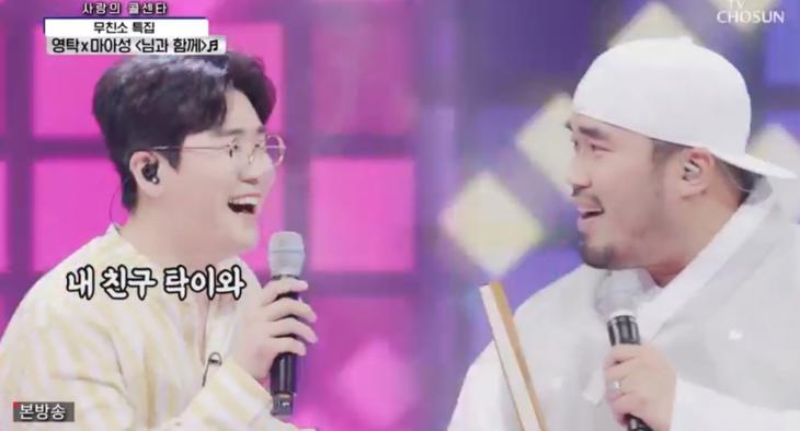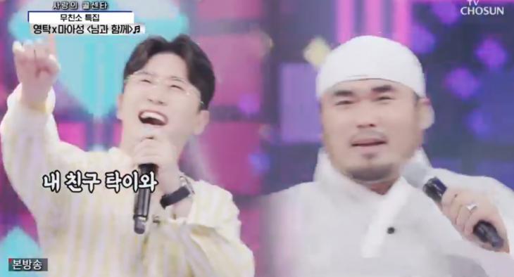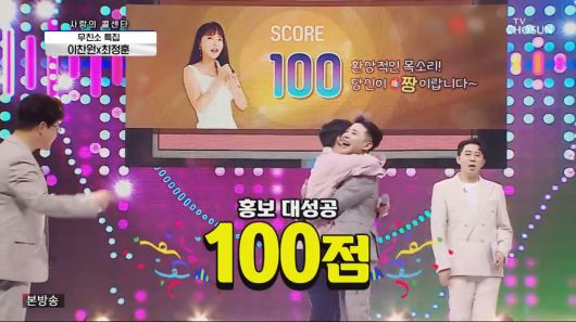 "미트' 출연 당시 찌르기 춤으로 인기를 끌었다"면서 친구의 스타성을 강조한 이찬원은 미스터T의 '딴놈 다 거기서 거기'를 선곡해 최정훈과 발랄한 듀엣 무대를 꾸며 100점을 기록했다.