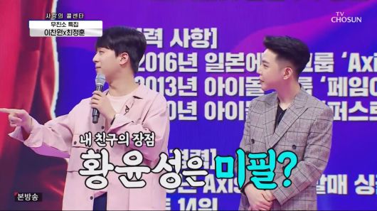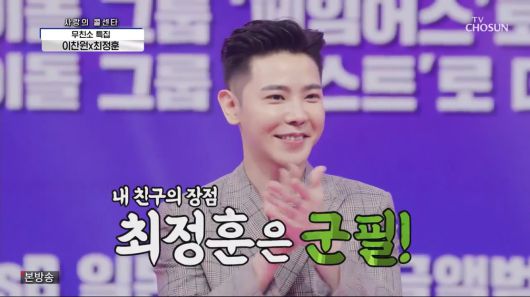 이찬원은 최정훈에 대해 "트로트계 없어서는 인재"라며 "황윤성은 2년 안에 군대에 가야하지만 이 친구는 군필"이라고 어필해 웃음을 자아냈다.