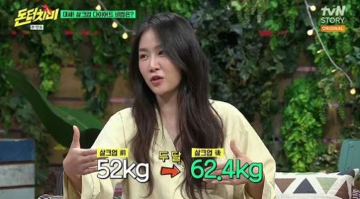MC 오윤아는 "소유 씨는 최근에 '살크업'(운동을 하지 않고 일부러 지방량을 증가시키기 위해 음식을 가리지 않고 먹는 행동을 의미)을 했다고 한다"며 운을 뗐다.