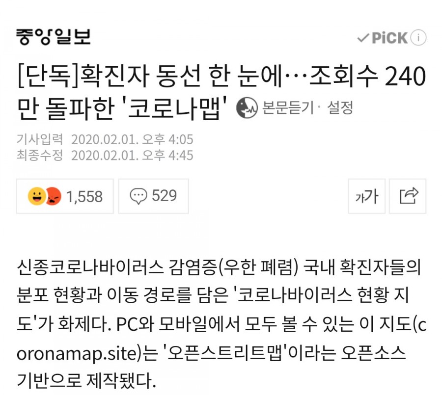 그는 “이번 신종 코로나바이러스 사태로 친구들이 다 불안해하고 있고, 오히려 공포를 조성하는 정보들이 많다고 생각해 코로나맵을 제작하게 됐다”고 밝혔다.