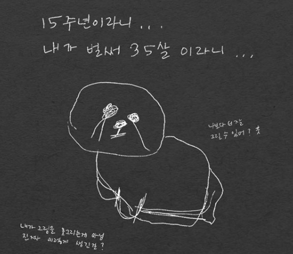 그는 "안녕! 잘 지내고 있나요? 저는 나름 잘 지내고 있어요. 너무 많이 보고 싶고 그리워요"라며 "15주년이라니... 내가 벌써 35살이라니.."라는 글과 함께 좌절하는 그림을 그려 보는 이들의 웃음을 자아냈다.