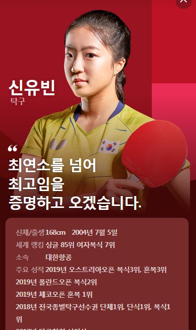 초등학교 3학년 때 국내 최고 권위 종합선수권에서 대학생 선수를 완파한 신유빈은 2019년 대표 선발전 통과로 만 14세 11개월 16일의 최연소 국가대표 기록을 썼다.