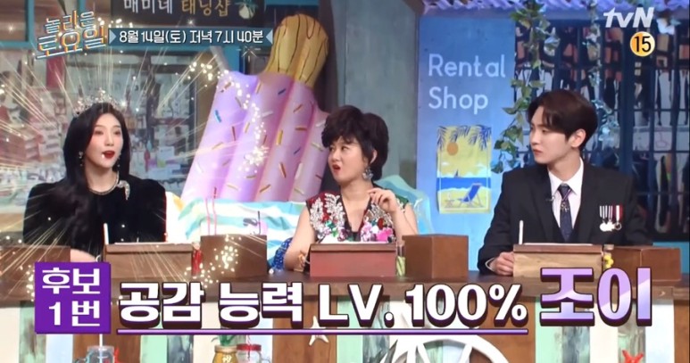 과거 조이는 '놀토'에 레드벨벳 웬디와 함께 출연한 바 있다. 당시 그는 닭갈비가 상품으로 걸린 라운드에서 오렌지캬라멜의 '방콕시티' 노래 가사를 받아 적었다.