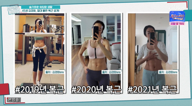 잠시의 휴식도 용납하지 않는 김경화는 바쁜 와중에도 헬스장에 들러 몸매 관리에 나섰는데, 5년간 유지한 ‘애둘맘’ 김경화의 ‘명품 식스팩’ 자태를 자랑했다.