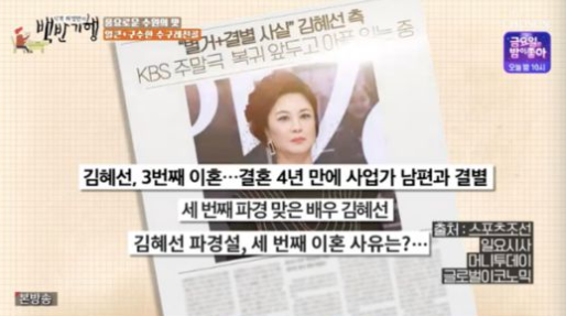 이에 김혜선은 "연습하는 날 기사가 터졌다. (극중 인물이) 대본을 보거나 연기를 했을 때 '어쩜 내 상황과 비슷할까' 싶었다"며 "그냥 철판을 깔고 했다. 아픔과 슬픔을 가슴에 담고 연기에 더 전념할 수 있었다"고 답했다.