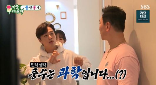 안현모는 "아이가 없어가지고 고를 때 기준을 '방이 많은 것보다 주방과 거실이 큰 집을 고르자'라고 했다"라며 귀띔했고, 오민석은 풍수지리에 대해 알려주겠다며 집을 둘러봤다.