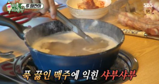 김종민은 거품 가득한 맥주에 고기를 넣고 "이게 샤부샤부다"고 자신 있게 말했다. 김준호는 먹어봤냐고 물었고, 김종민은 처음 해보는 거라고 했다. 하지만 비명만 지르고 요리에 실패했다.