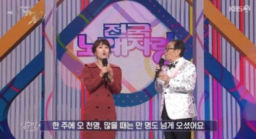 송해는 "숫자에 빠진 사람들이 있다. 나무에 올라간 사람, 지붕 위에 올라간 사람도 있다"라고 너스레를 떨었다.