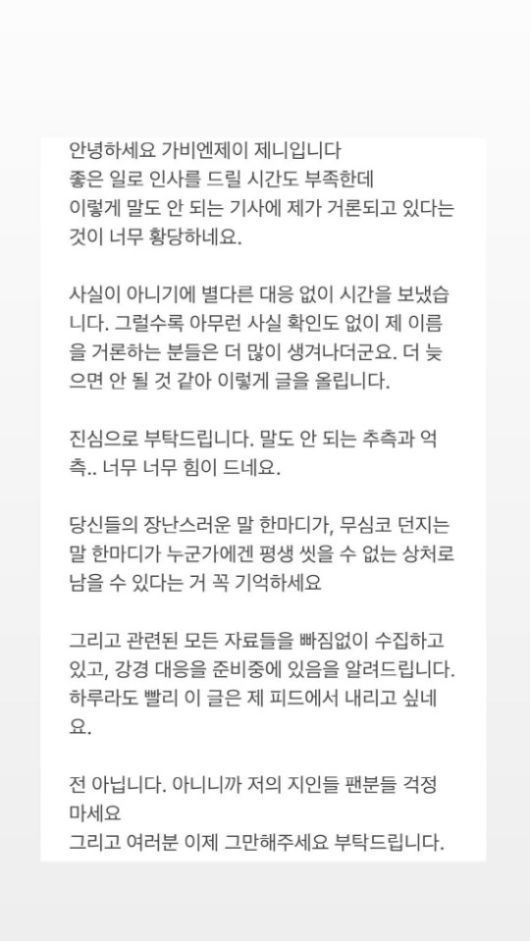 가비엔제이 제니는 자신의 인스타그램을 통해 “좋은 일로 인사를 드릴 시간도 부족한데 이렇게 말도 안 되는 기사에 제가 거론되고 있다는 것이 너무 황당하다”며 말문을 열었다.