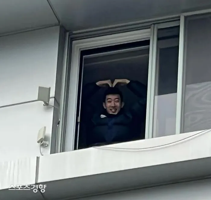 공개된 사진 속 조현우는 머리 위로 하트를 만들며 카메라를 응시하고 있다.
