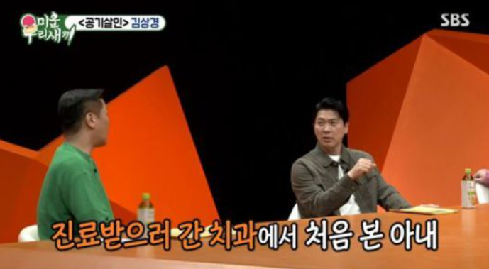 신동엽은 김상경에게 “치과의사인 아내가 가슴을 떨리게 한 첫 번째 여자라고 하더라”라고 물었고, 김상경은 “조금 과장이…”라고 했고, 서장훈은 “(그 말은) 믿지도 않는다”라고 말해 웃음을 안겼다.