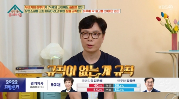 김영하 작가는 글을 쓰는 비법을 공개했는데 "저는 규칙이 없는 게 규칙이다, 아침에 일어나서 글이 잘 안 써지면 안 쓴다"라며 "소재는 어디서나 온다"라고 말했다.