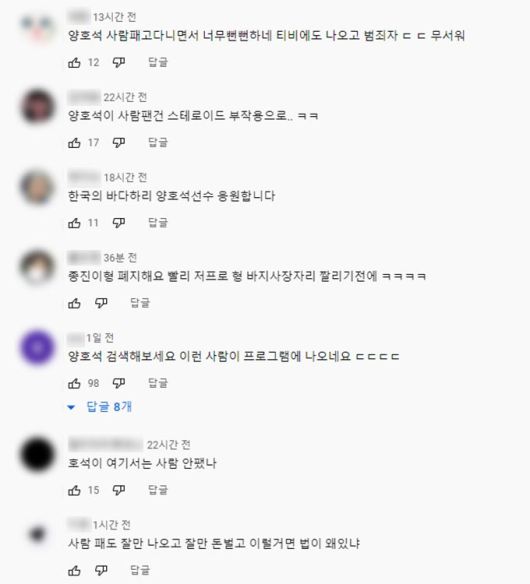 양호석이 출연하는 '에덴' 유튜브 영상에는 "과거 폭행 논란을 일으킨 사람이 방송에 나오는 것이 불편하다"는 반응이 이어졌다.