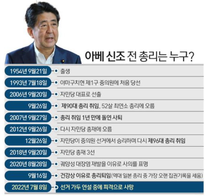 아베 신조 전 일본 총리가 선거 유세 중 총격을 당해 심폐정지 상태에 빠졌다가 사망하는 사건이 일어나 관심이 높아지고 있다.