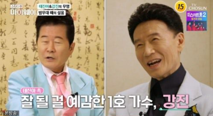 태진아는 “절대 중간에 포기하지 말라고 했다. 노래를 잘하지 않냐. 강진이의 특이한 매력이 있다. 너희는 노래를 잘하니까 잘 될 거라고 했던 1호가 강진, 2호가 진성이다”라고 밝혀 눈길을 끌었다.