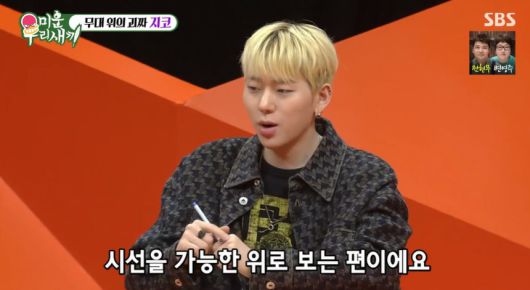 이어 지코는 강한 이미지 때문에 순해 보이는 표정을 연구 중이라면서 “내가 눈매도 찢어지고 인상 자체도 날카롭다. 그래서 가능한 시선을 위로 보는 편이다. 온화해 보이려 한다”고 말했다.