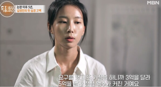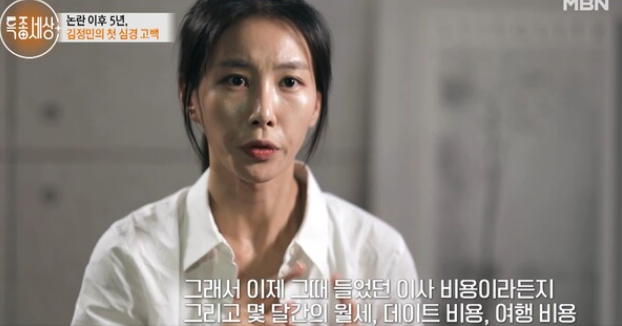 김정민은 "남자친구와 헤어지는 과정에서 문제가 생겼다. 사귀면서 썼던 돈, 데이트 비용이라든지 이사 비용, 월세, 여행 비용, 선물 등등 다 합해서 1억 원을 제게 달라고 요구했다."고 말했다.