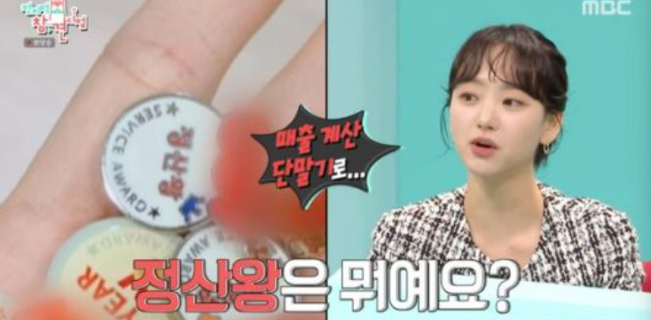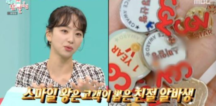 그러면서 영화관 아르바이트를 하며 받은 표장 배지도 공개했다. 오차가 없이 매출을 계산한 '정산왕', 친절함으로 받은 '스마일왕', 전 지점 공식 인증 해당 지점 1등 아르바이트생에게 주어지는 'CS스타' 등 표창 배지가 감탄을 자아냈다.