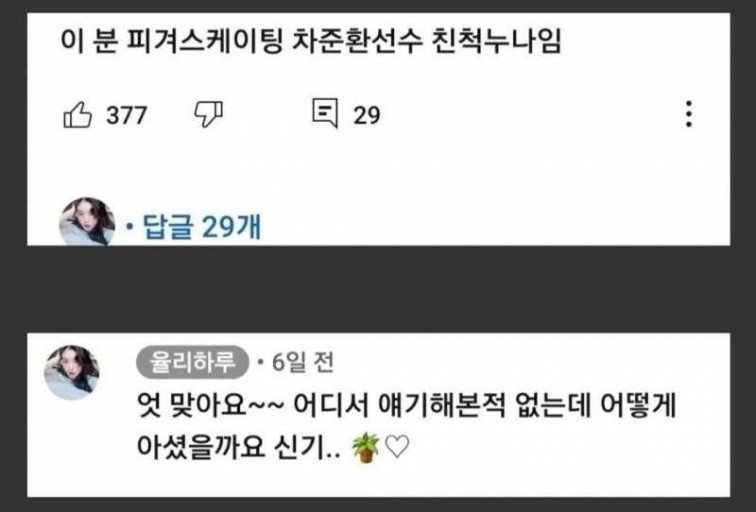 뷰티 유튜버 율리가 사촌 누나로 알려져 있으며, 율리가 댓글에서 밝혔으며, 인스타그램 스토리에서 차준환의 경기를 응원하기도 했다.