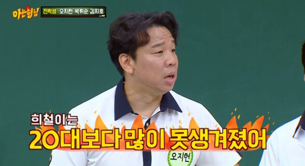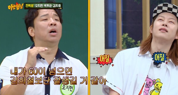 오지헌은 돌연 김희철을 향해 “20대보다 많이 못생겨진 것 같다”라고 지적했다. 그러면서 “내가 60살이 되면 만날 것 같다. 60살 넘으면 김희철 보다 잘생길 것 같다”면서 “20년만 있으면 잡을 것 같다”라고 거듭 강조해 웃음을 안겼다.
